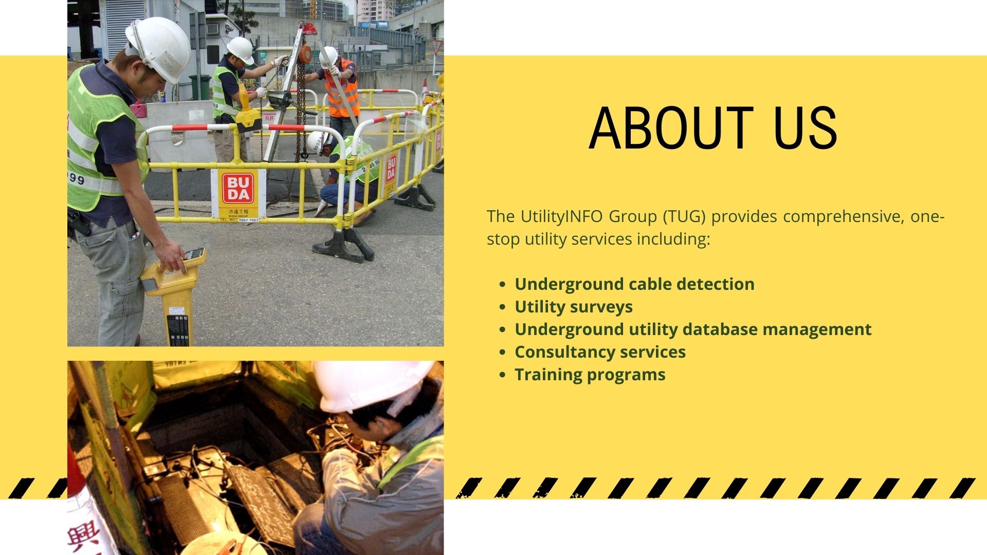 The UtilityINFO Group (TUG) provides comprehensive, one-stop utility services. These include underground cable detection, utility surveys, underground utility database management, consultancy services, and training.