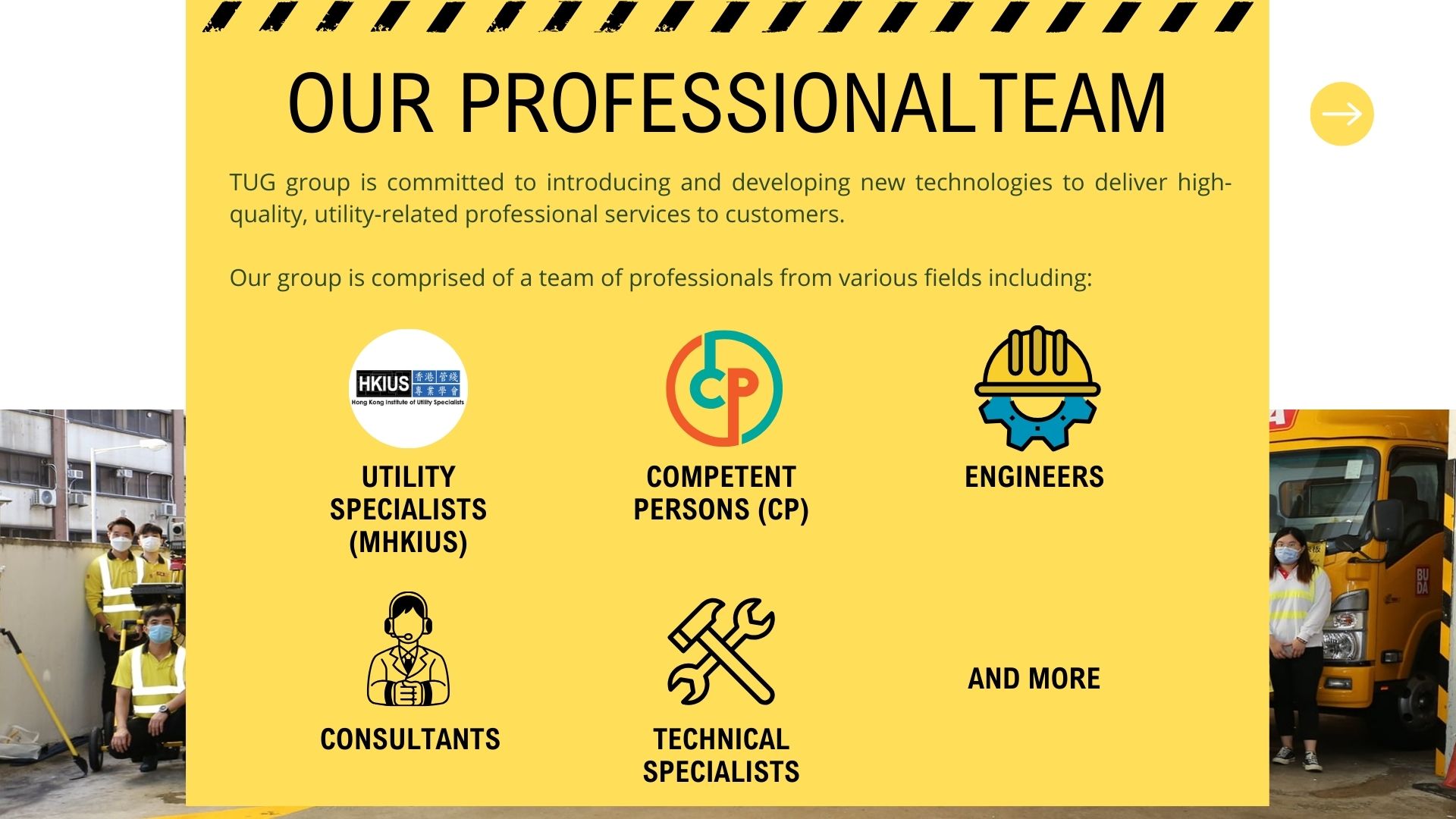 TUG is comprised of a team of professionals from various fields, including Utility Specialists (MHKIUS), Competent Persons (CP), engineers, consultants, and more. The group is committed to introducing and developing new technologies to deliver high-quality, utility-related professional services to customers.